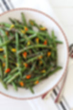 Heat up a large cast-iron skillet over high heat and cook the green beans until slightly charred and blistered, about 10-12 minutes, tossing often.